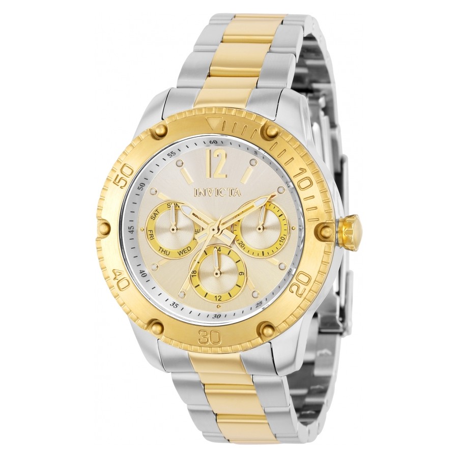 Model Invicta 36727 má krásne zlato - strieborné prevedenie s prepracovaným zlatým ciferníkom. Na tomto ciferníku nájdete indikátor duálneho času, dňa v týždni a dňa v mesiaci. Hodinky poháňa kvalitný japonský strojček. Tento ciferník má priemer 38 milimetrov a je chránený flame fusion krištáľom, ktorý je omnoho odolnejší ako minerálne sklíčko.
