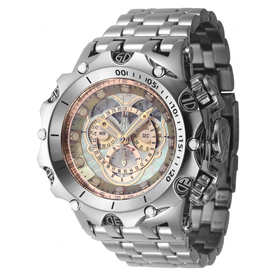 Kolekcia Venom patrí k najsilnejším a zároveň k najextravagantnejším modelom z celej rodiny Invicta. Model Invicta 10788 má prevedenie v jemnej striebornej farbe, ktorú dopĺňa neprehliadnuteľná zlatá luneta. Vo vnútri sa ukrýva švajčiarsky strojček Ronda s kalibrom 5040.D Chronograf na meranie 60 sekundových, 30 minútových a 1/10 sekundového intervalu...